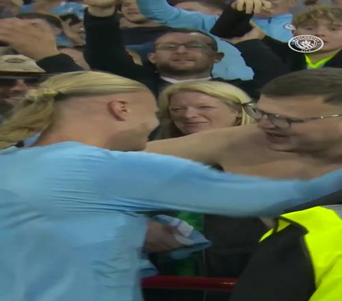 亲切互动!哈兰德赛后送球衣,球迷激动拥抱+献吻