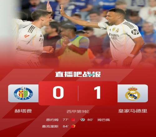 2分领跑!皇马1-0九人赫塔费 姆巴佩制胜维尼修斯替补造两红
